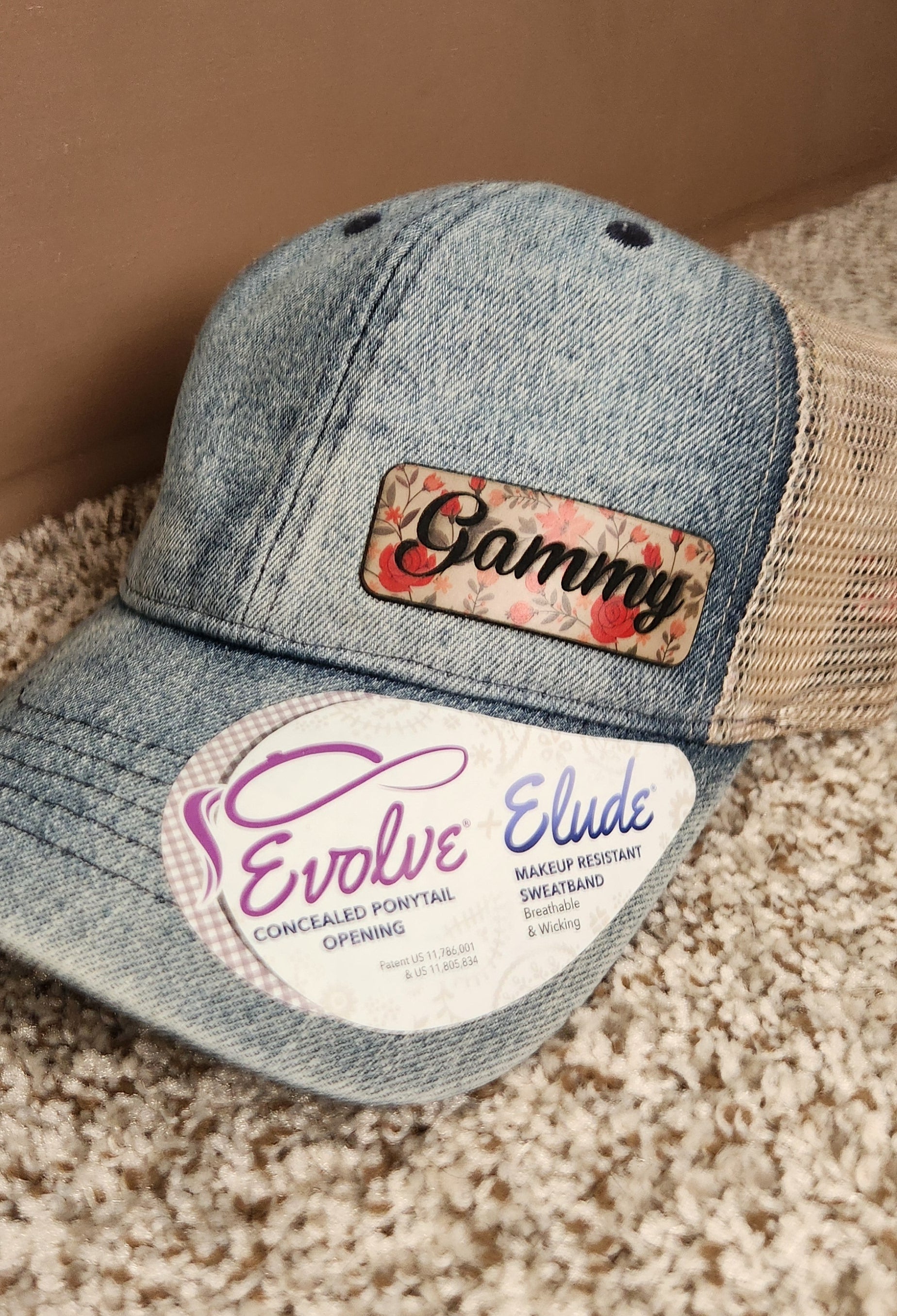 Our Better Than Roses Hat has a mesh back with a hidden ponytail holder and an adjustable closure. It is a denim/khaki, unstructured, six-panel, low-profile style with a washed look and a floral pattern under the visor.