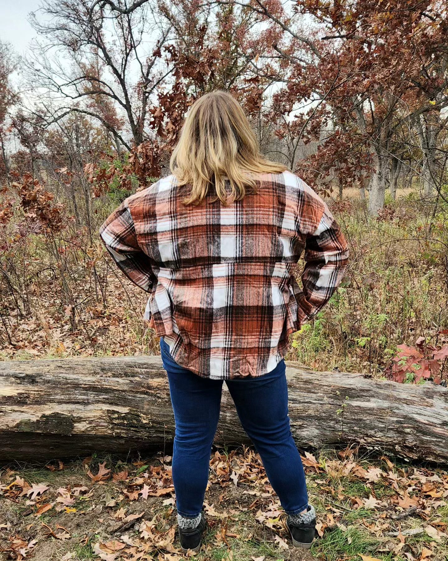 This super soft shacket is perfect for any fall day! An allover plaid print, front chest pockets, and tortoise buttons create a chic style. Throw on this loose laidback layer over our graphic tees to make the cutest fall outfit!
