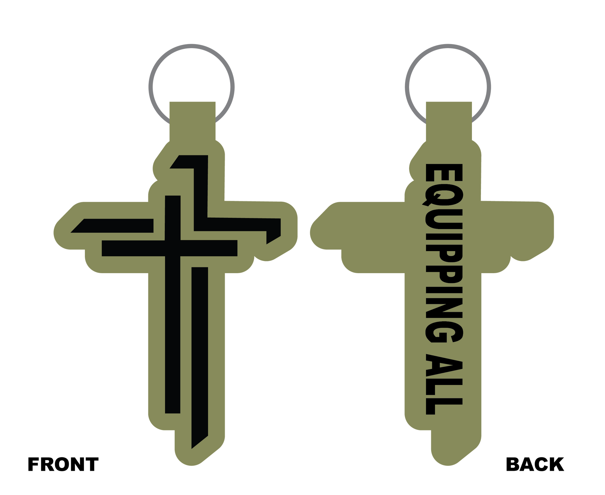 The Cornerstone Keychain measures 3x2 inches and features an olive color. It displays the Cornerstone logo on the front and slogan on the back, combining style and purpose in a compact design that supports the church wherever you go.