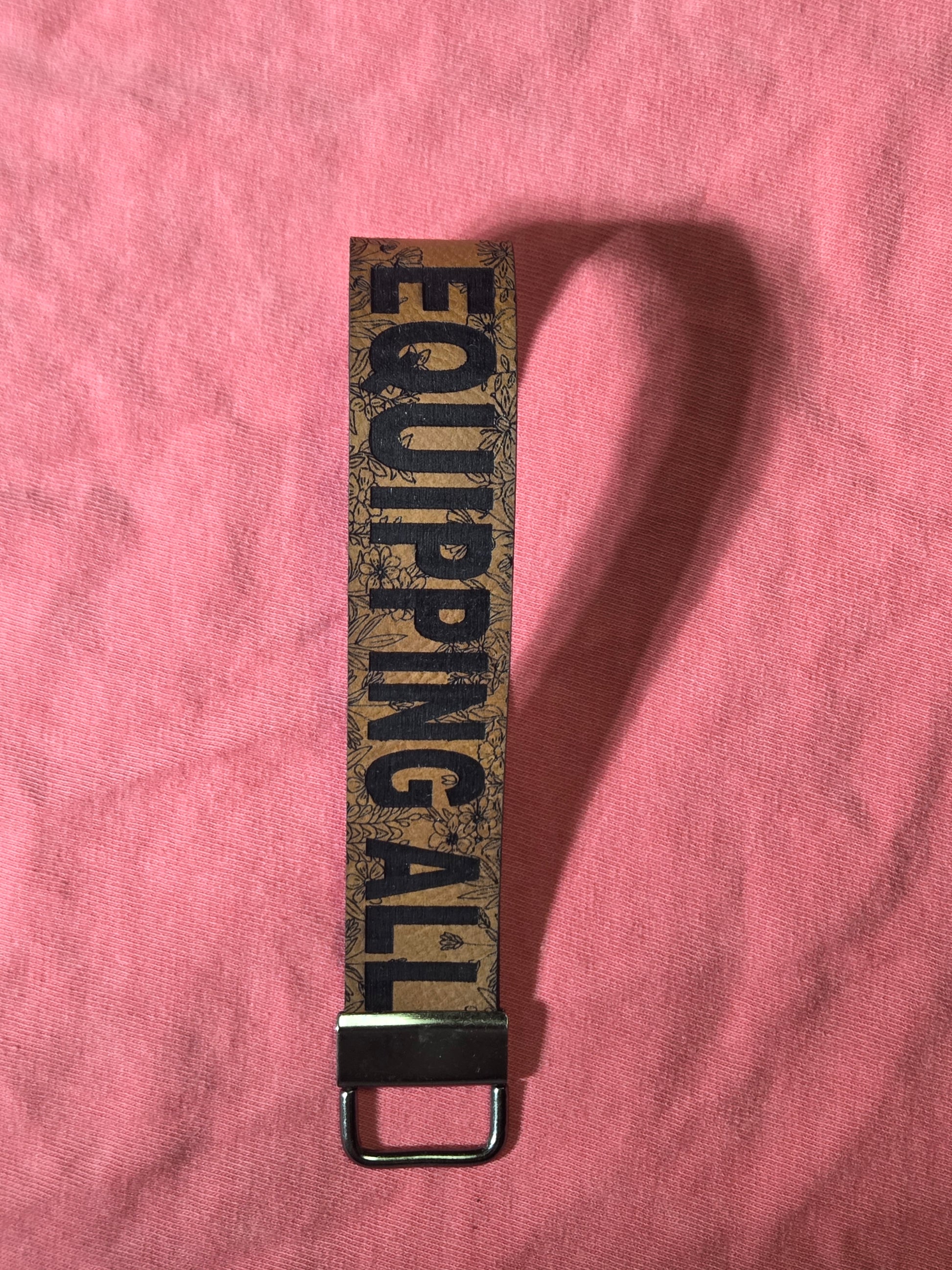 The Cornerstone wristlet keychain is 1" wide rawhide brown leatherette and fits mosts wrists. The keyring is silver.