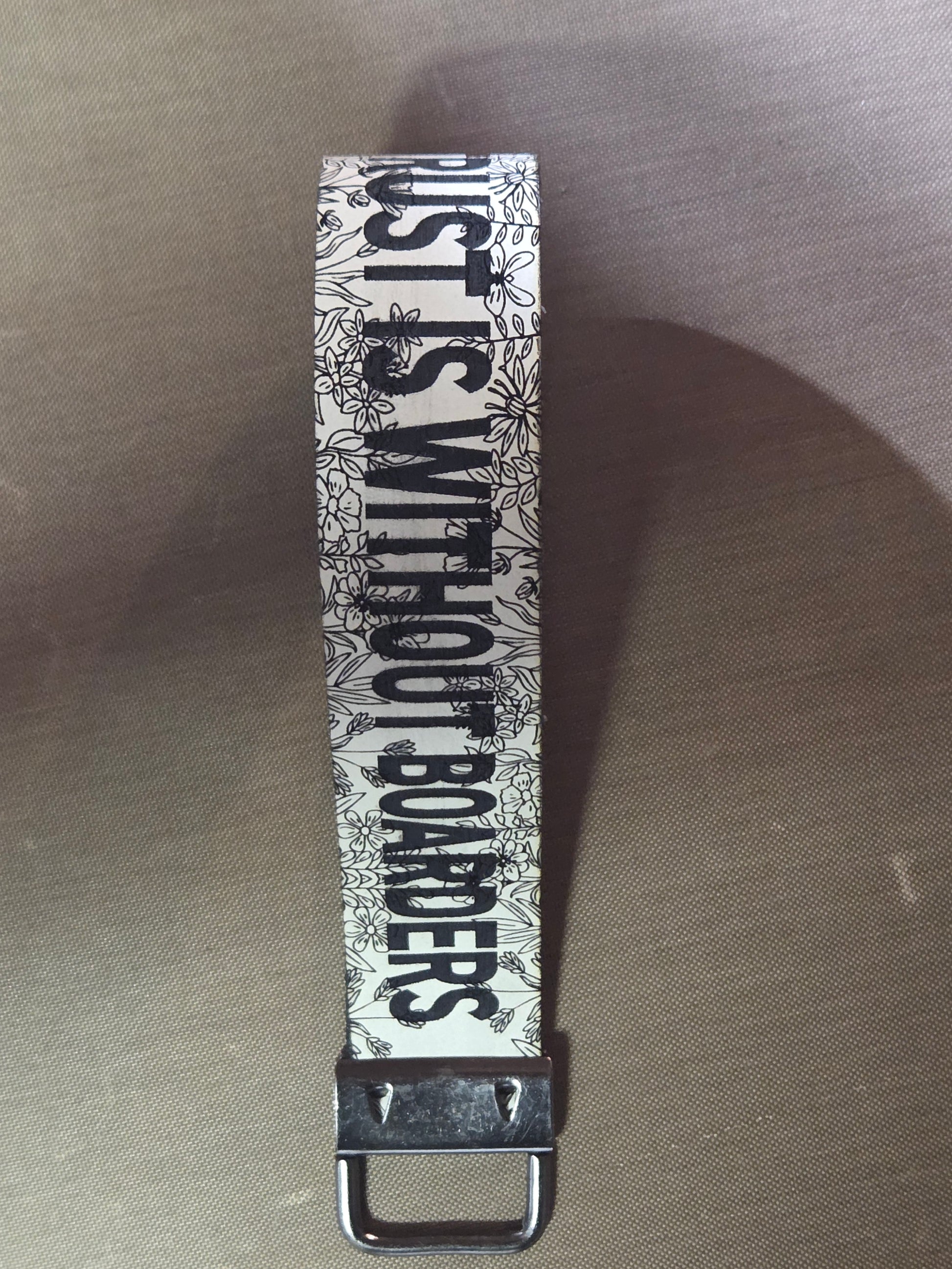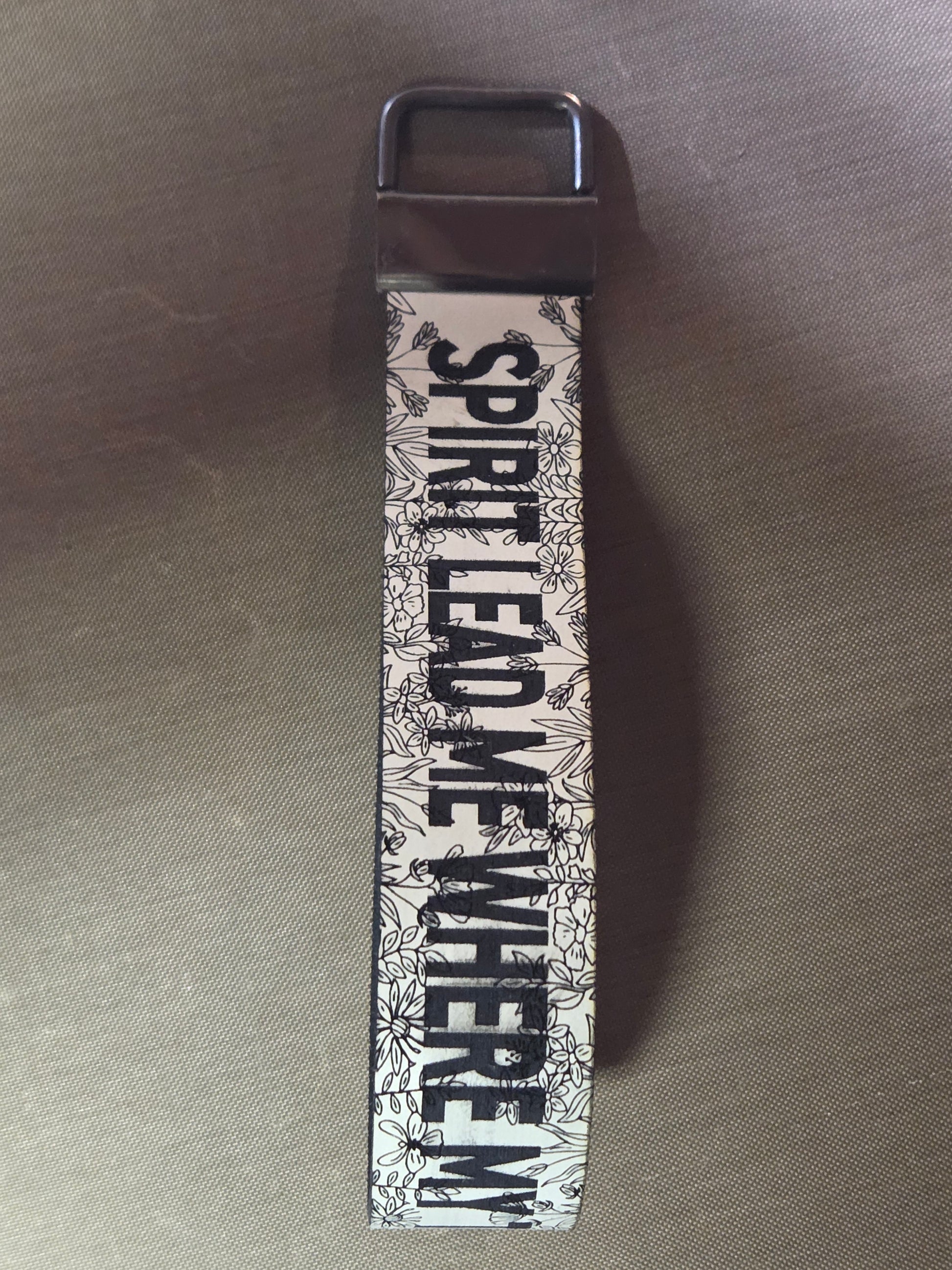 The Spirit Lead Me wristlet keychain is 1" wide rawhide brown or glow in the dark leatherette and fits mosts wrists. The keyring is silver.