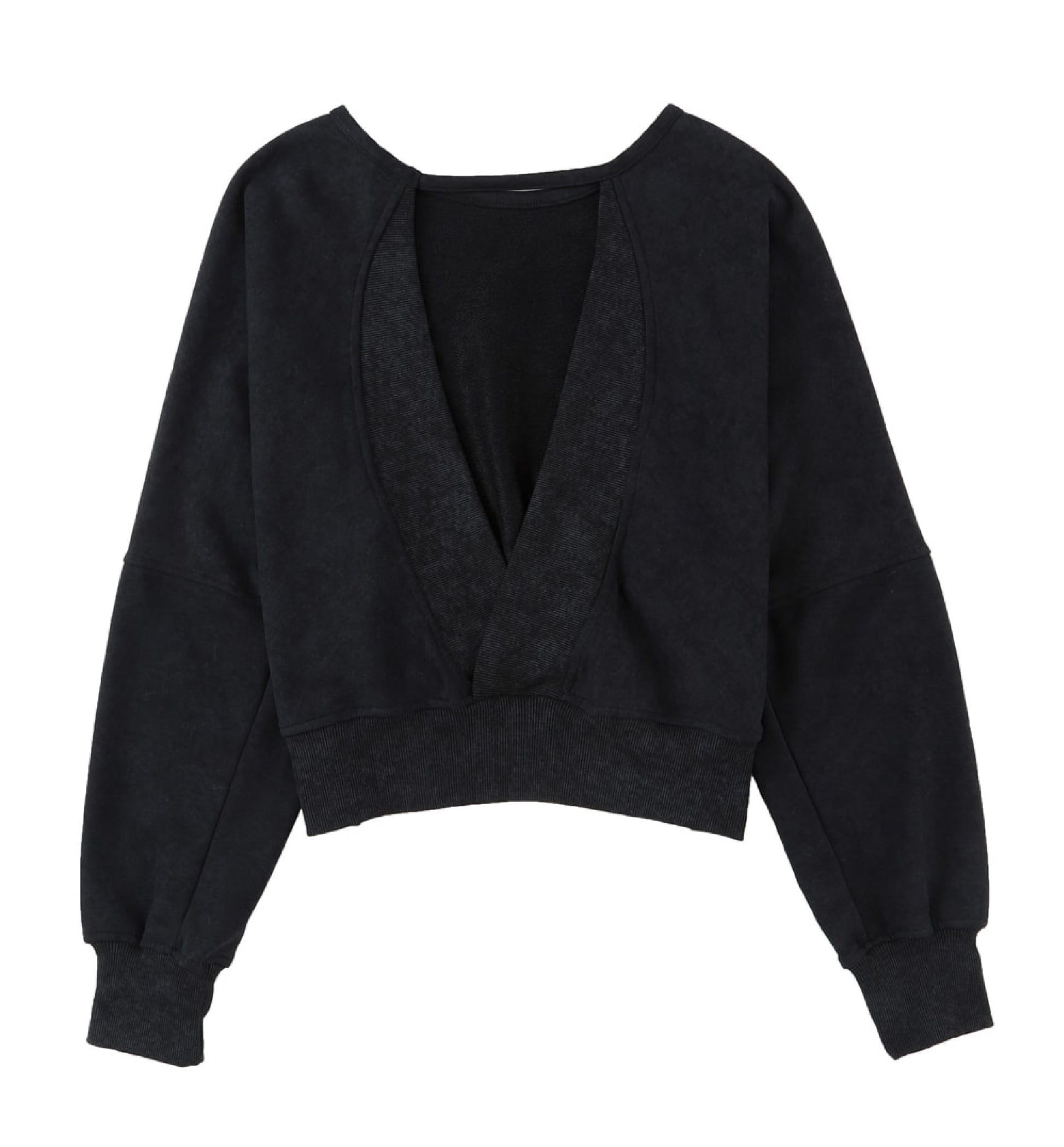 Crewneck sweatshirt with a unique v-shape open back that gives it a very edgy look! This black acid washed sweatshirt also has a relaxed cut with a drop shoulder hem. The bottom hem hits right at the top of mid rise jeans. 80% polyester/20% cotton.