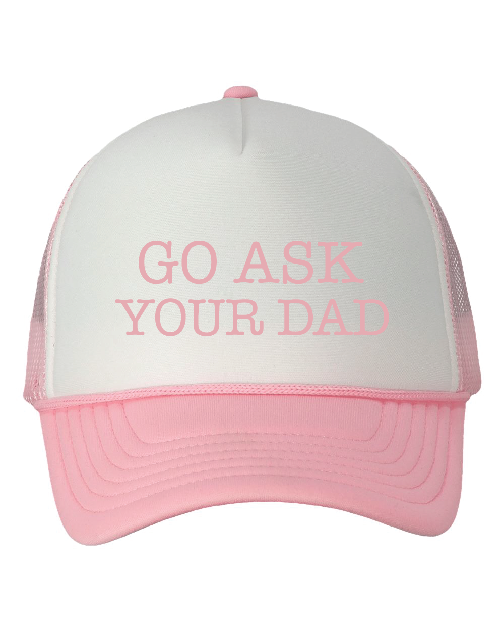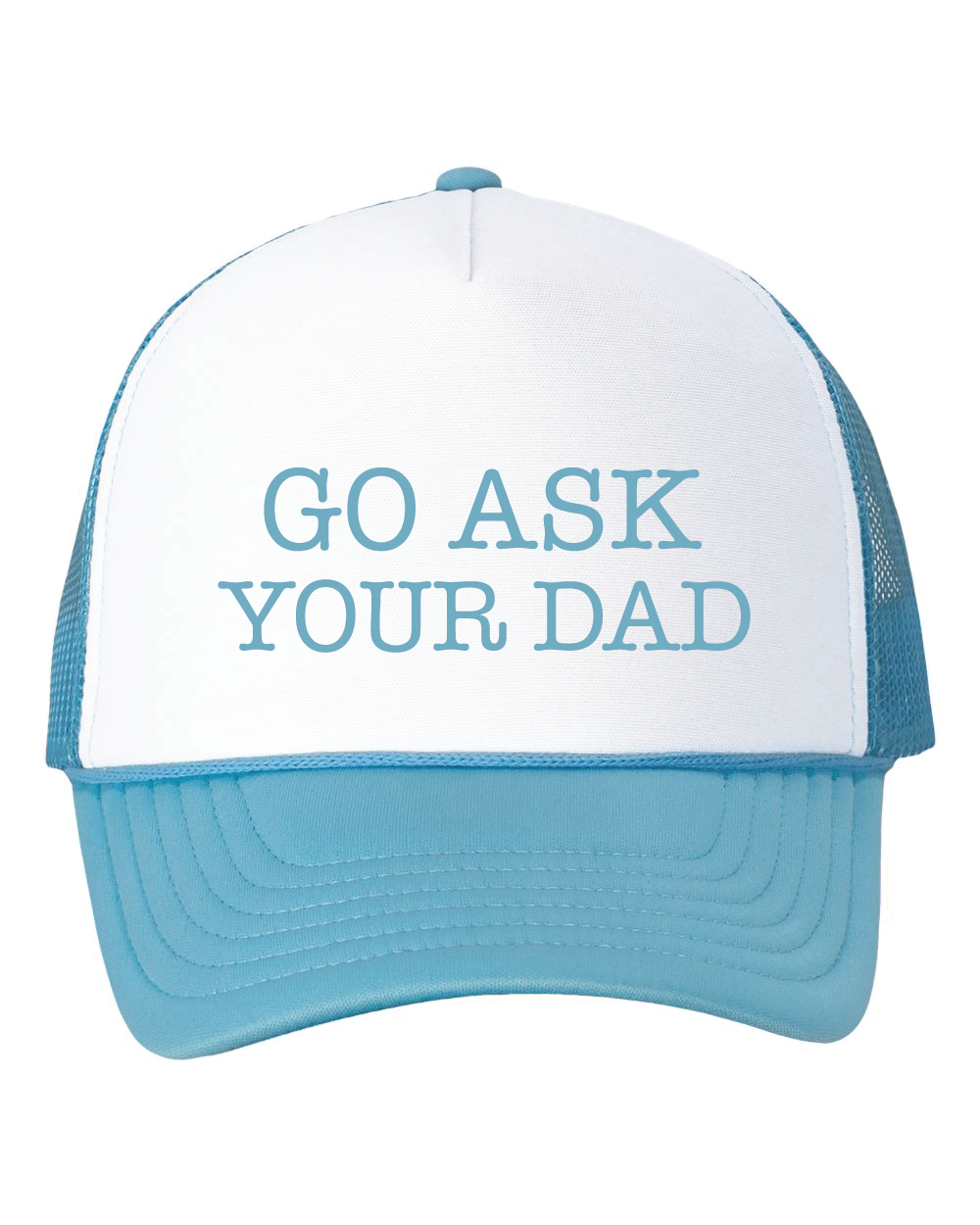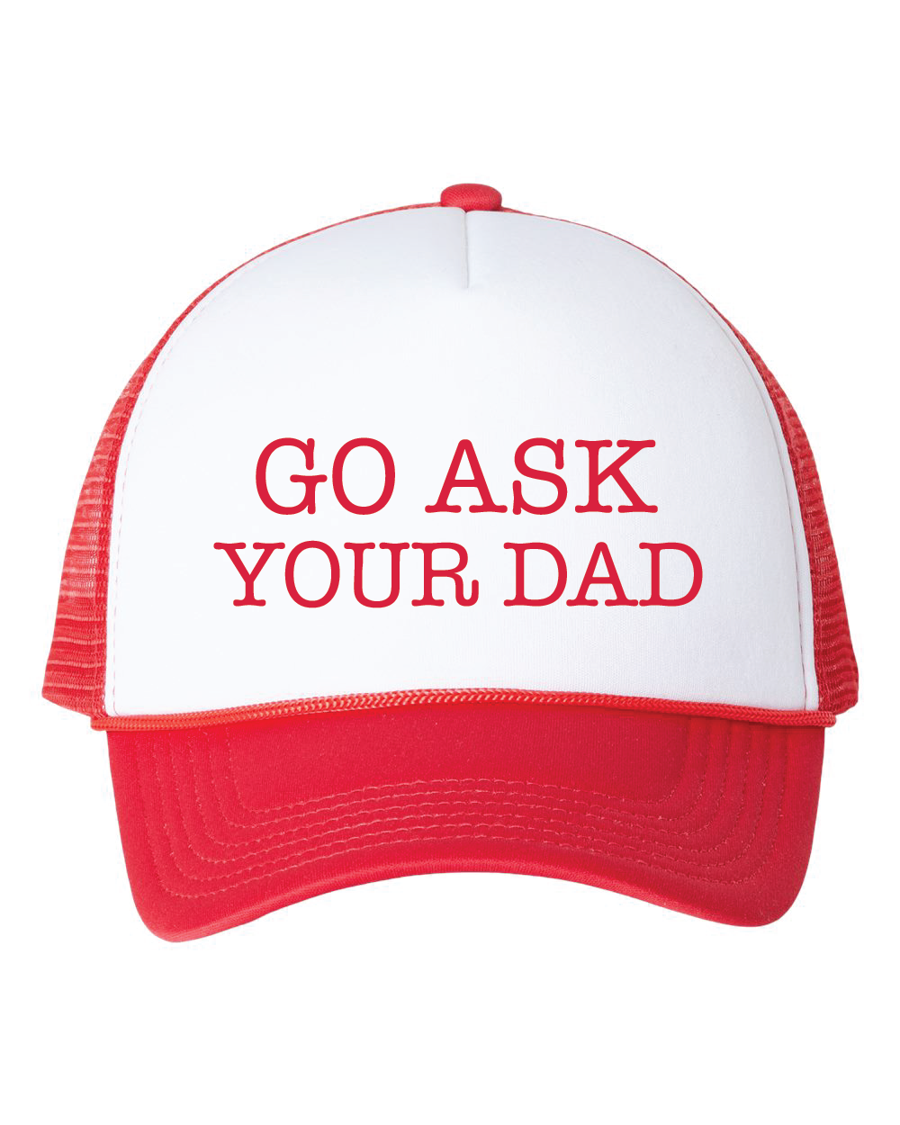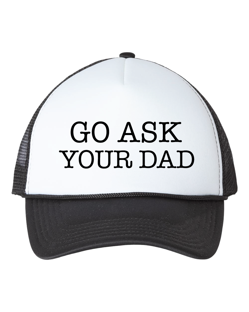 Give mom a break and go ask your dad with this playful foam front trucker hat. Perfect for Mother's Day or any day when mom is feeling 'mommed out'. Embrace the humor in parenting with this printed hat.