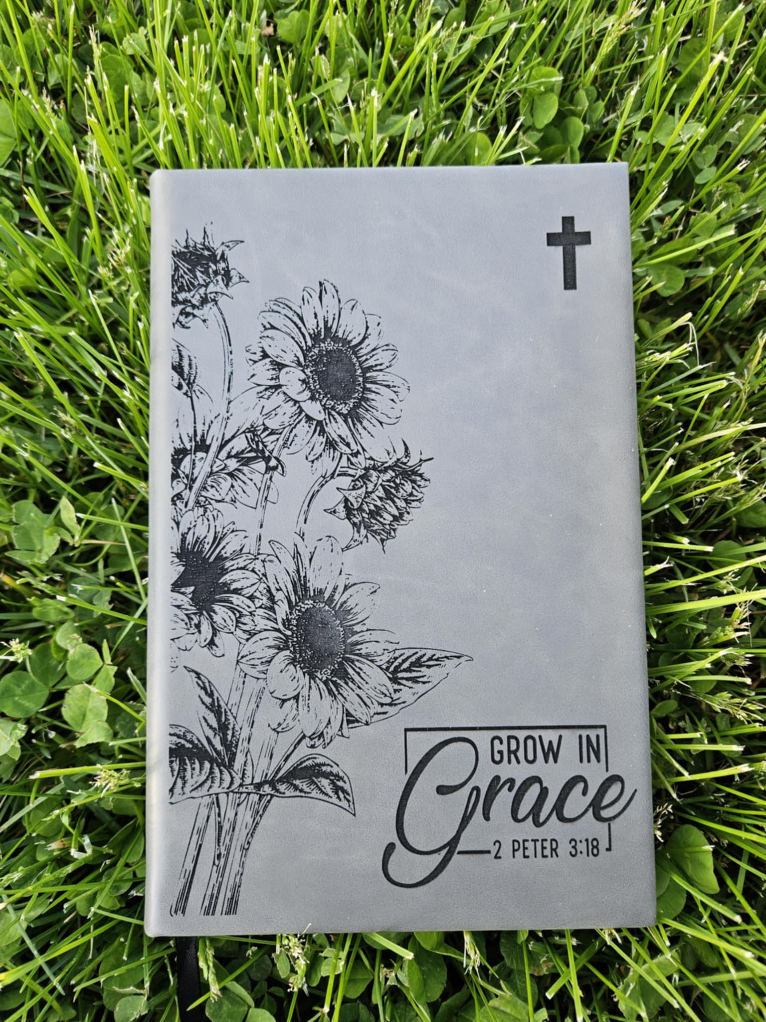 Experience personal growth and inner peace with our Grow in Grace Leather Notebook. Its sunflower design and laser engraved bible verse will inspire and uplift you. Crafted from charcoal leather, it's the perfect companion for journaling, planning, or note-taking. Stay organized and connected to your faith with this beautiful, Christian notebook.