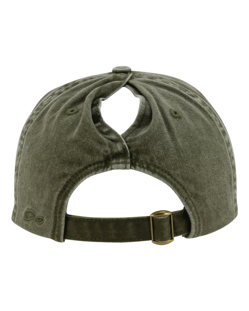 The Olive/Camo & Dusty Pink/Floral style are a 6 panel, mid-profile, structured hat with a hidden ponytail opening in the mesh.