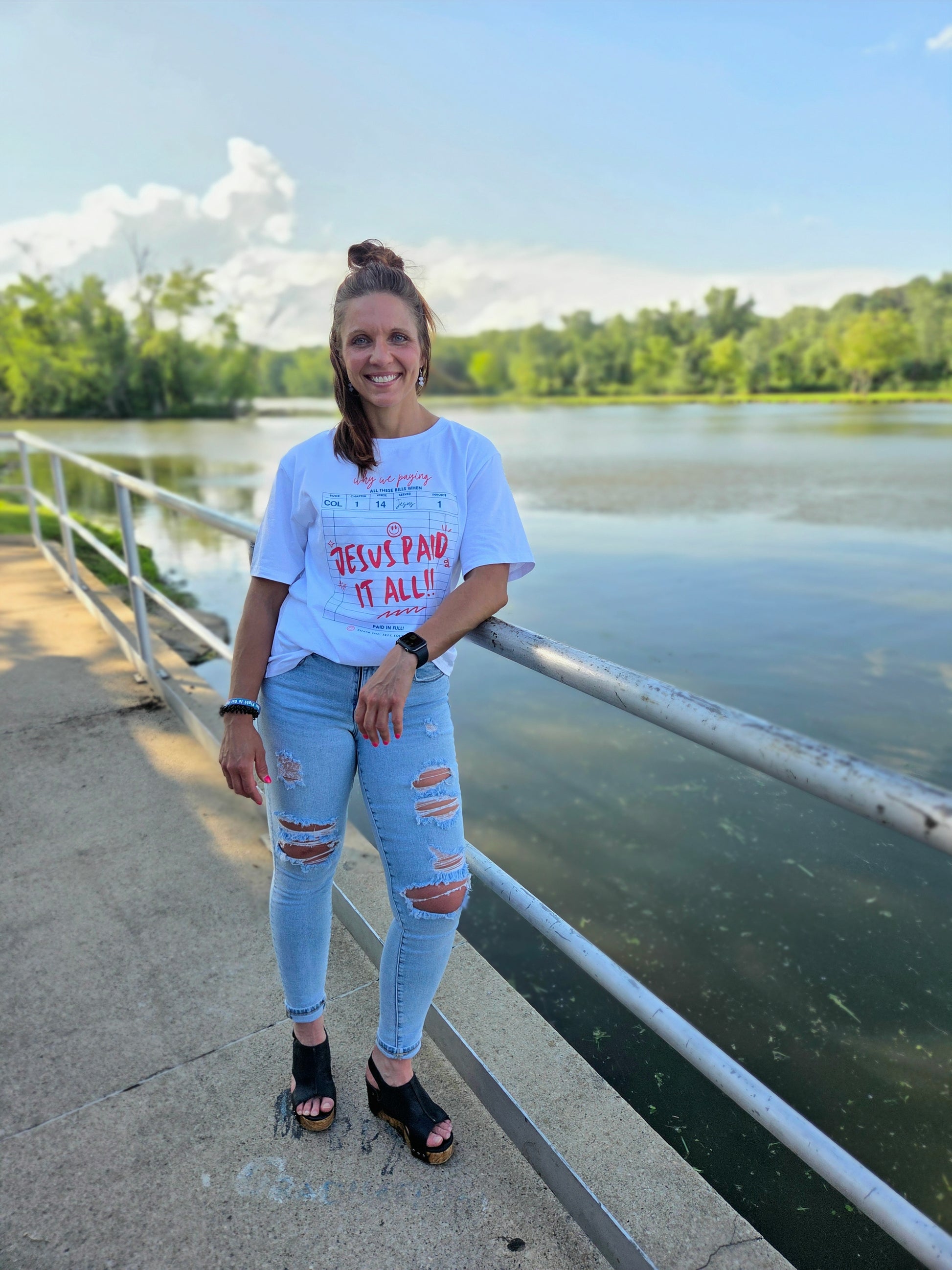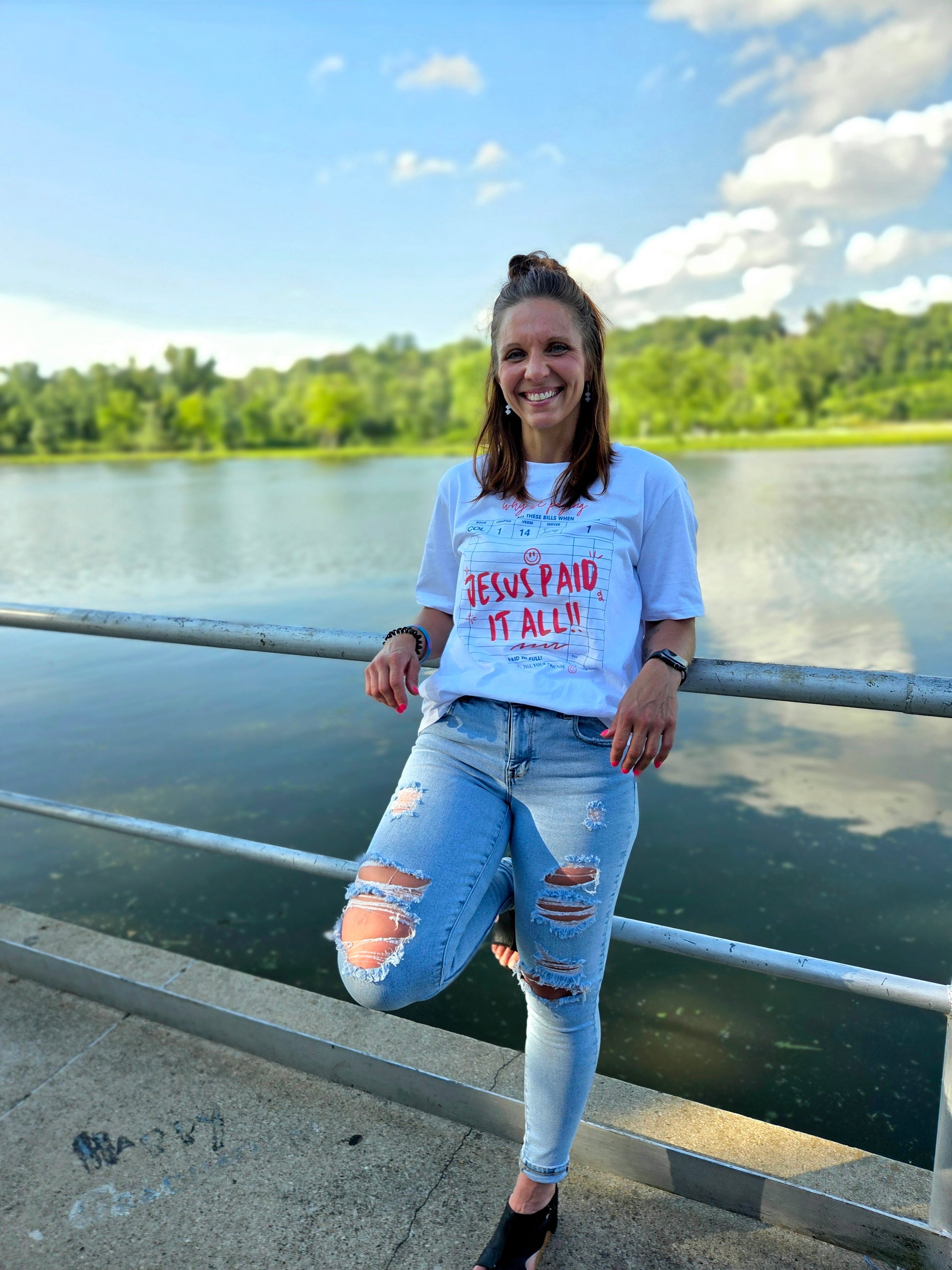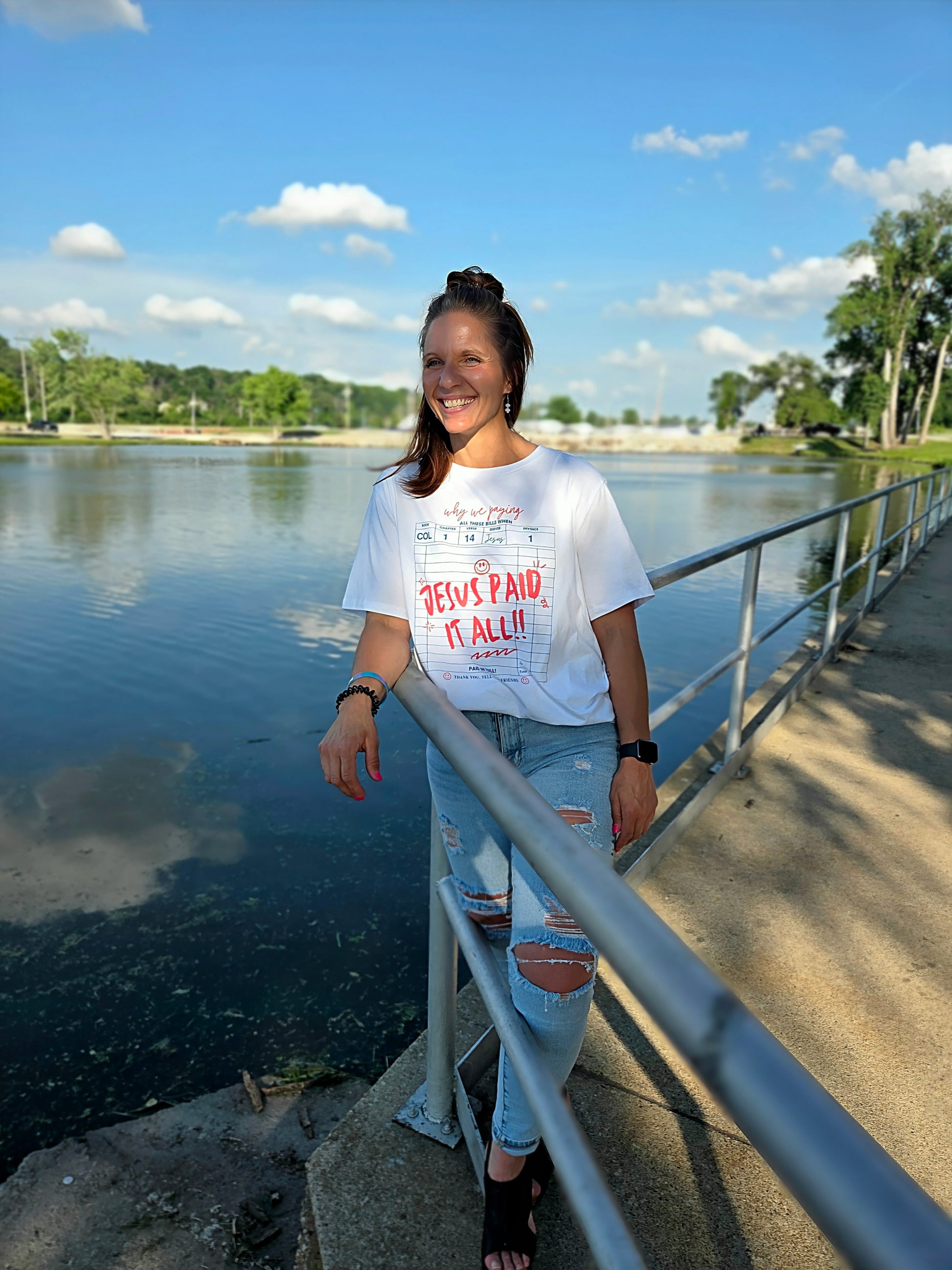 Our Jesus Paid Tee is a white ladies oversized tee that is 65% Polyester, 30% Cotton, 5% Spandex.