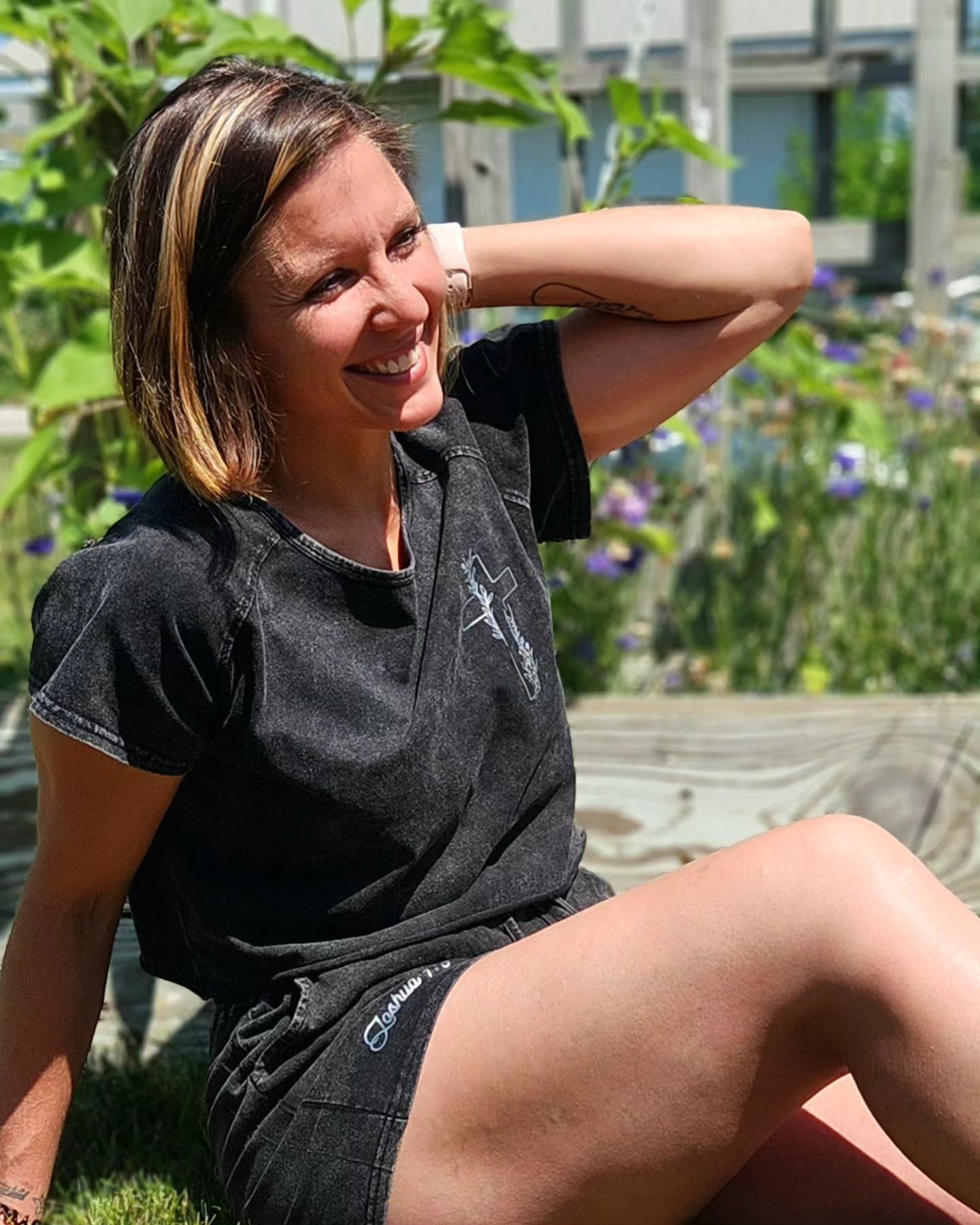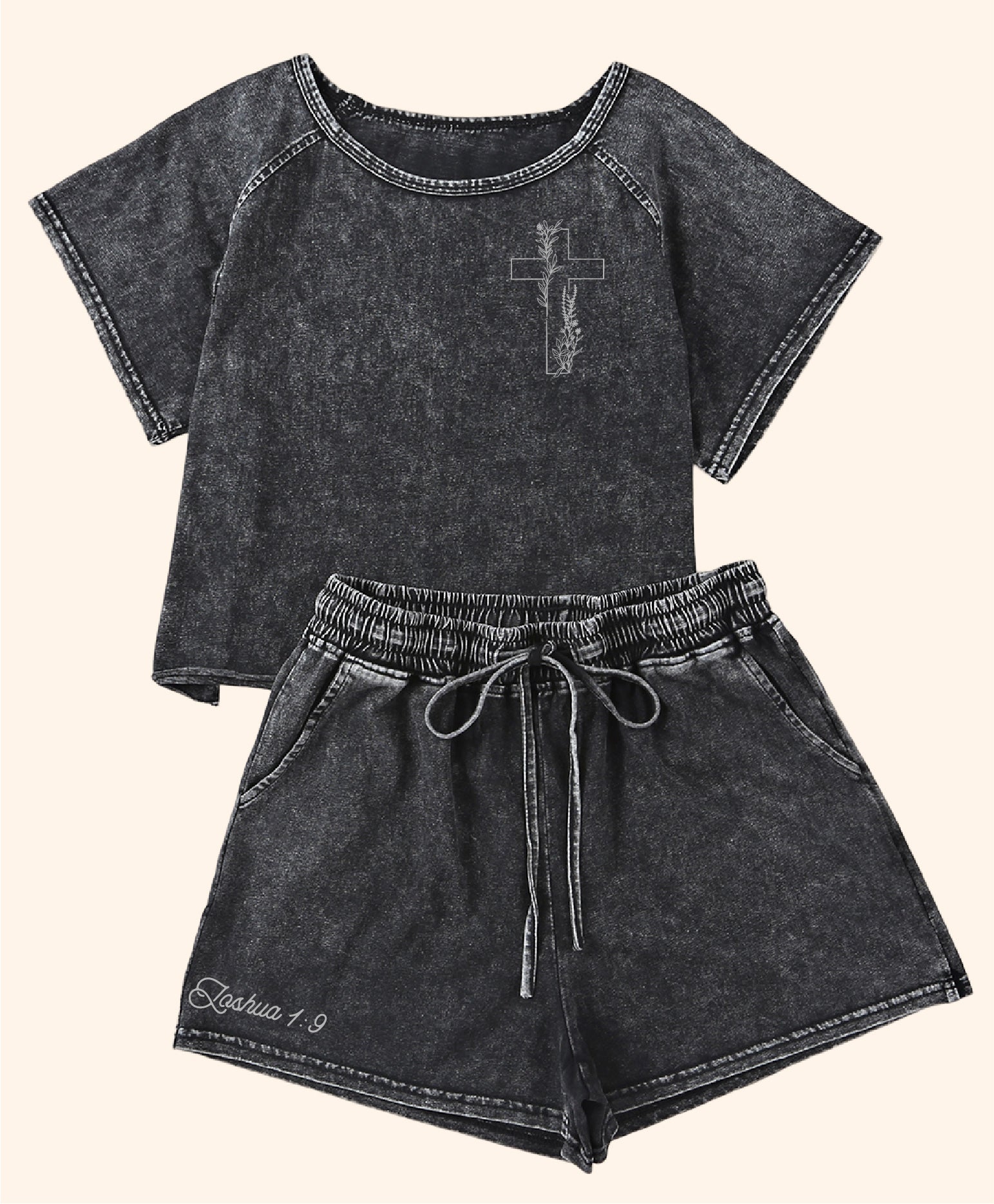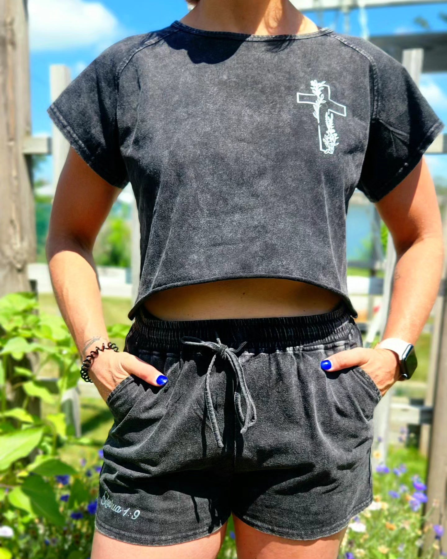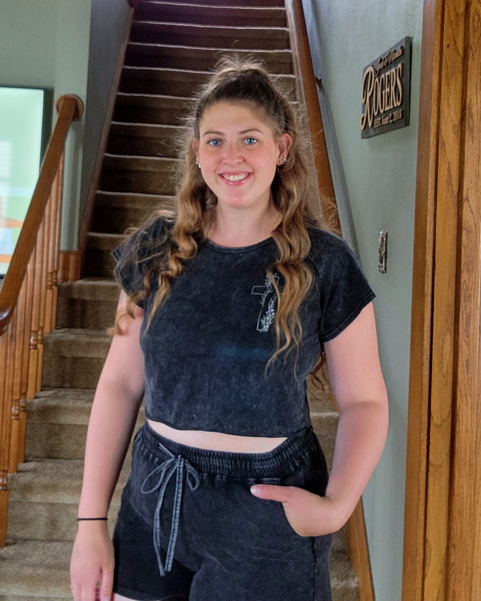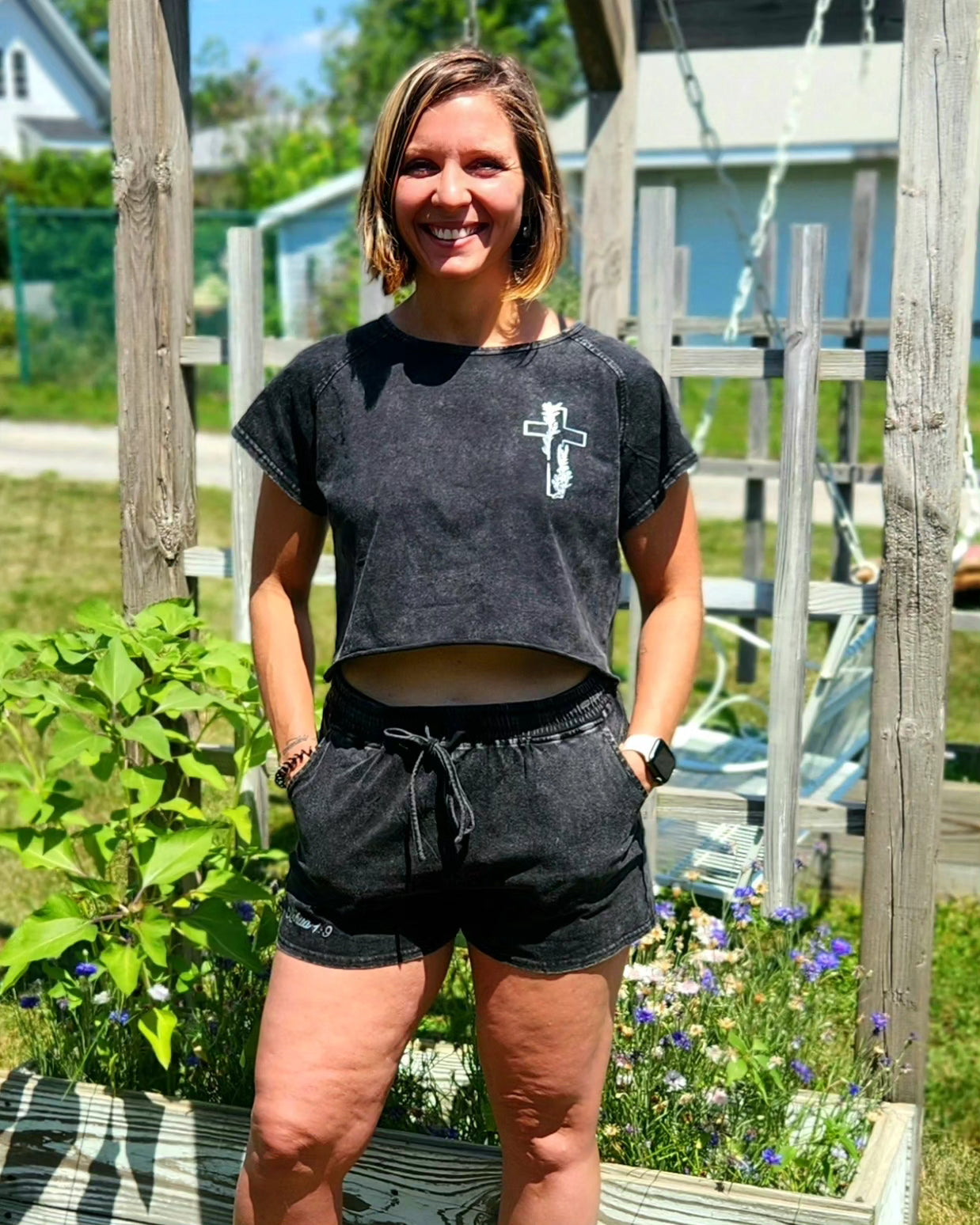 100% cotton lounge set. This set includes a short sleeve crop top and working drawstring shorts with elastic waistband.