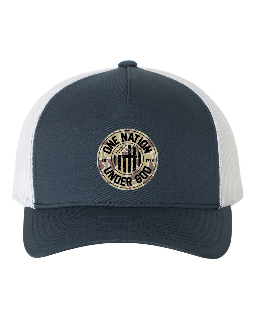This One Nation Trucker Patch Hat proudly displays the message of "One Nation Under God" along with a cross and EST 1776. Embrace your patriotic spirit with this stylish and meaningful accessory. Made with quality materials, this hat is perfect for any occasion. Show your love for your country with the One Nation Trucker Patch Hat.