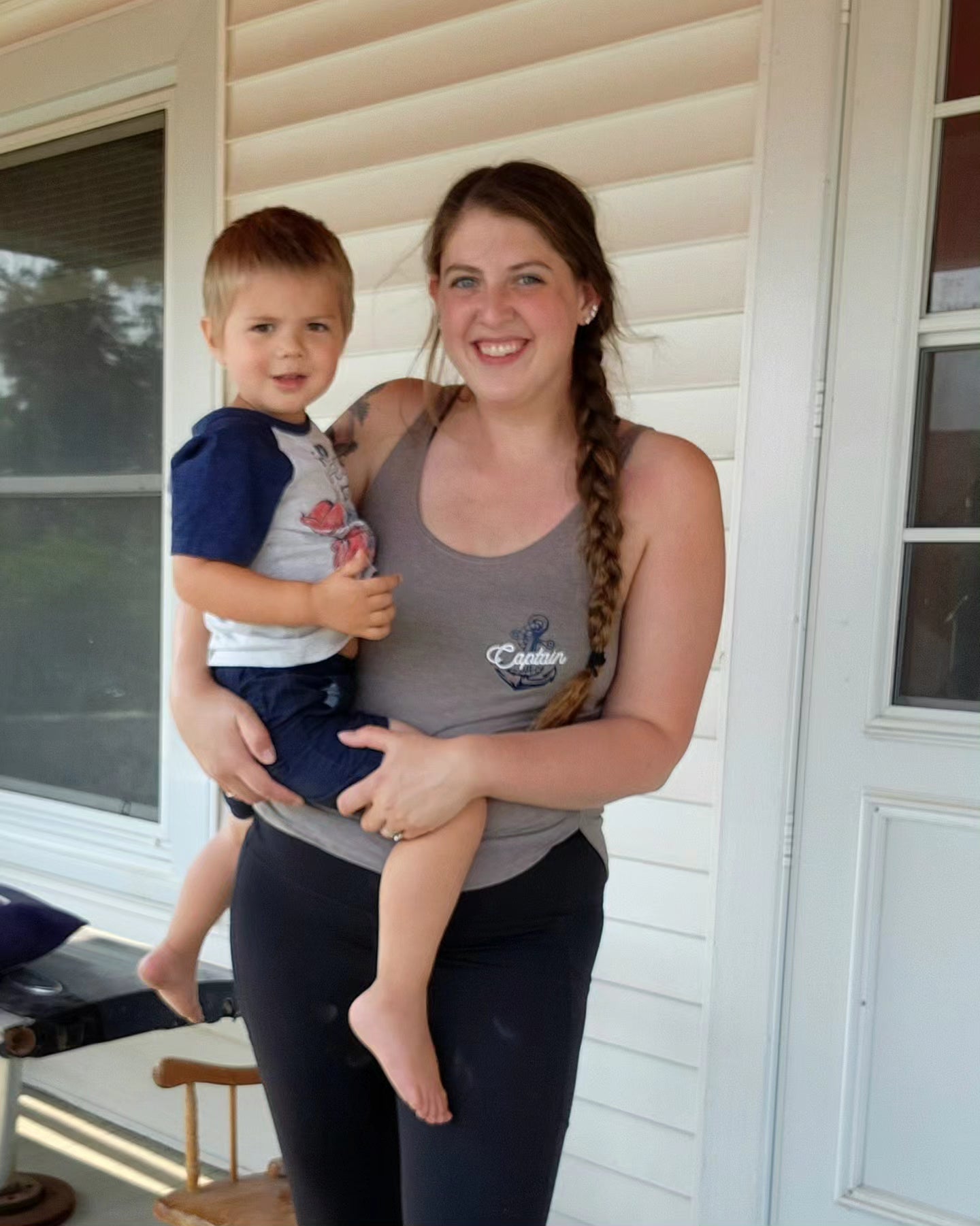 A left chest and full back design applied with white glitter ('Captain') and navy vinyl.
